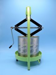 Данный тип пресса является прессом домкратным, он удобен и эффективен практически в любых условиях работы – при создании сока в домашних условиях, на даче или участке, в промышленных условиях. Сам домкратный пресс представляет собой прочную стальную раму, на которой закреплен домкратный механизм, поднимающий и опускающий круглый поршень. На крестовину опоры устанавливается поддон для сбора сока, на котором находятся бункер для мезги и кожух. Движение поршня осуществляется с помощью ручки-рычага. Благодаря такой конструкции обеспечивается сила отжима в две тонны без особых усилий.